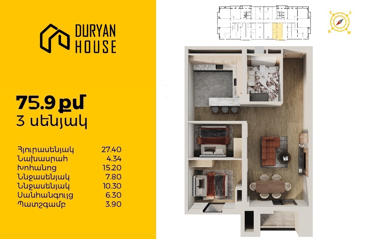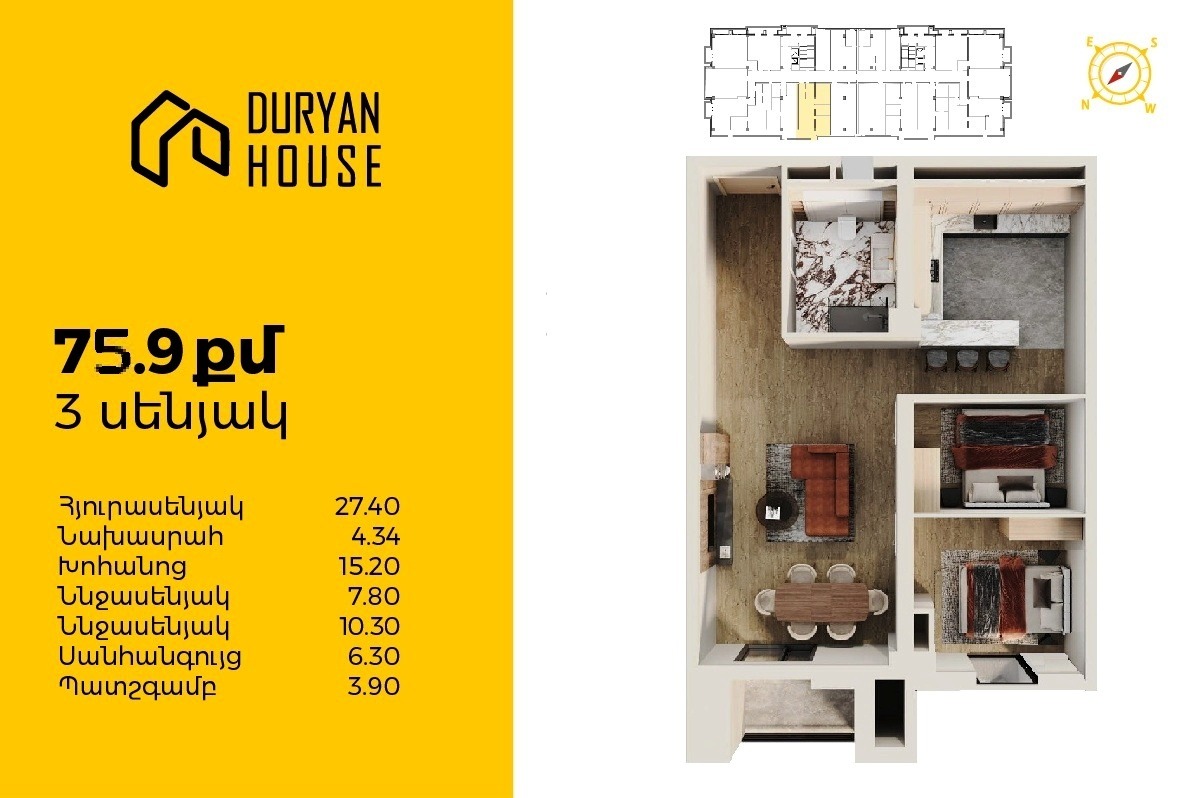 | 16-րդ հարկ | 85 քմ | 3 սենյակ