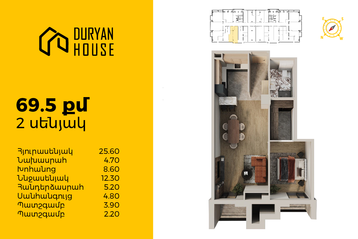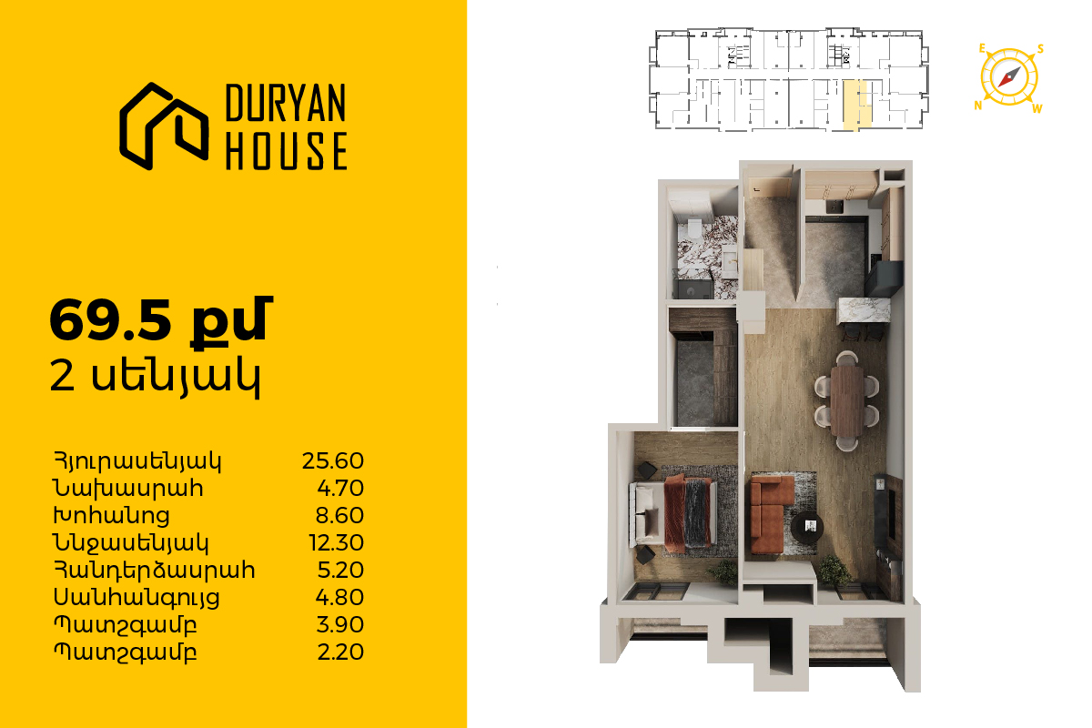 | 16-րդ հարկ | 70 քմ | 2 սենյակ