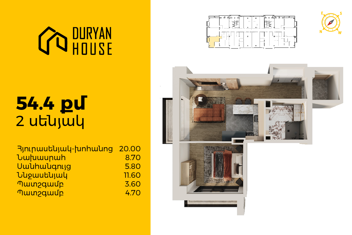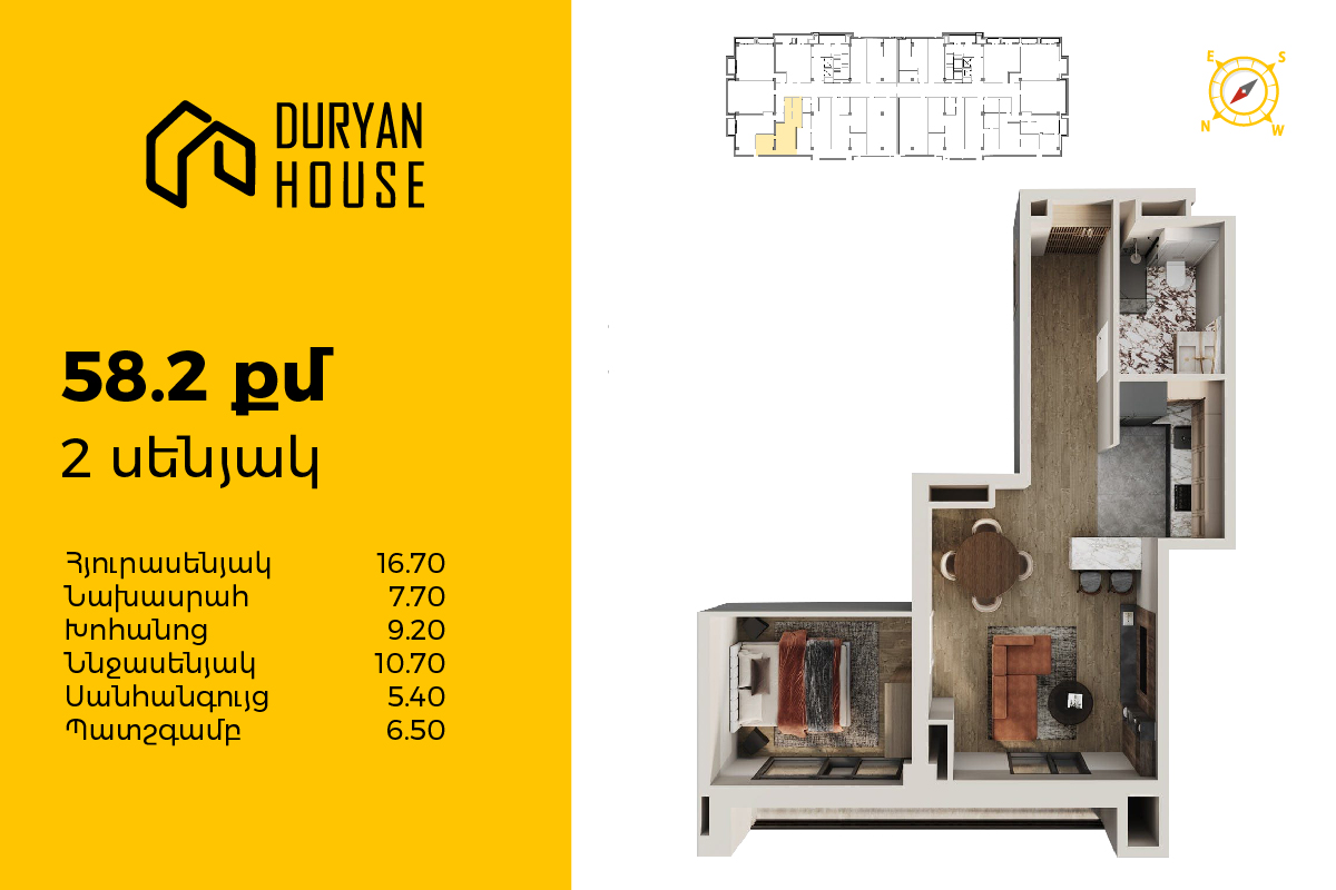 | 14-րդ հարկ | 58 քմ | 2 սենյակ