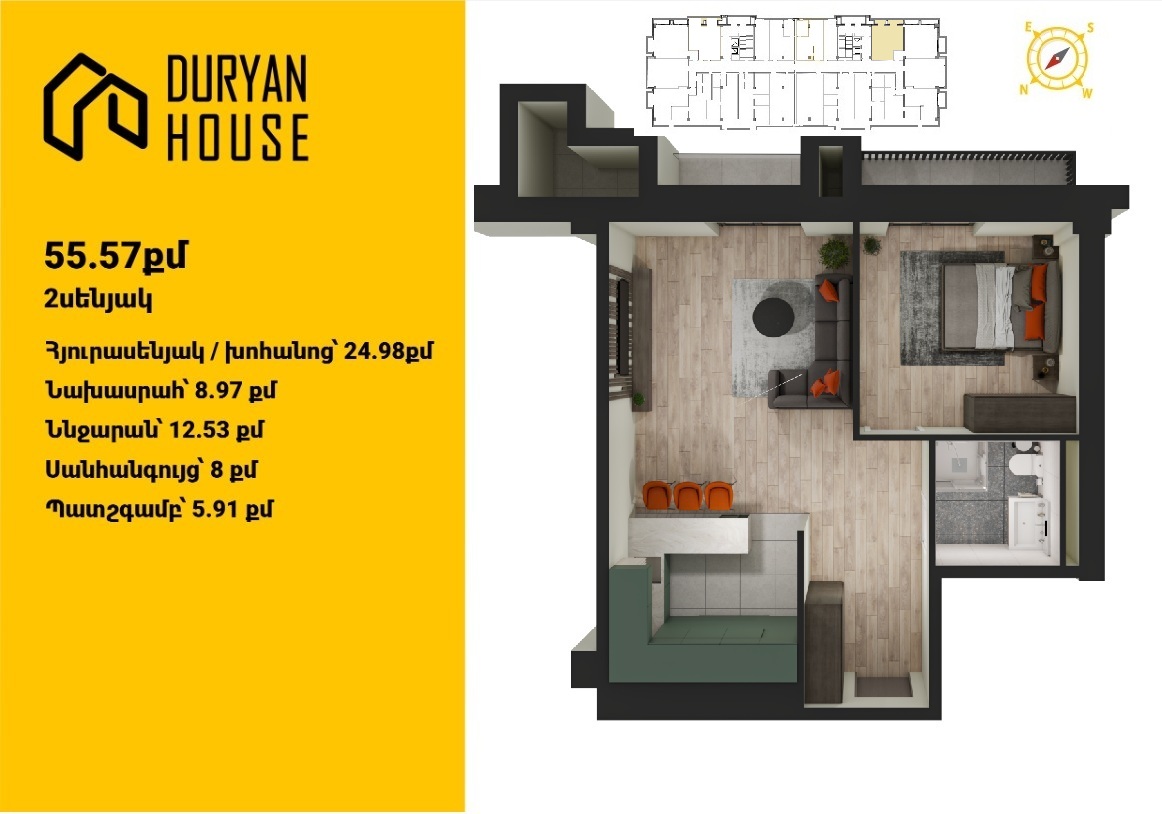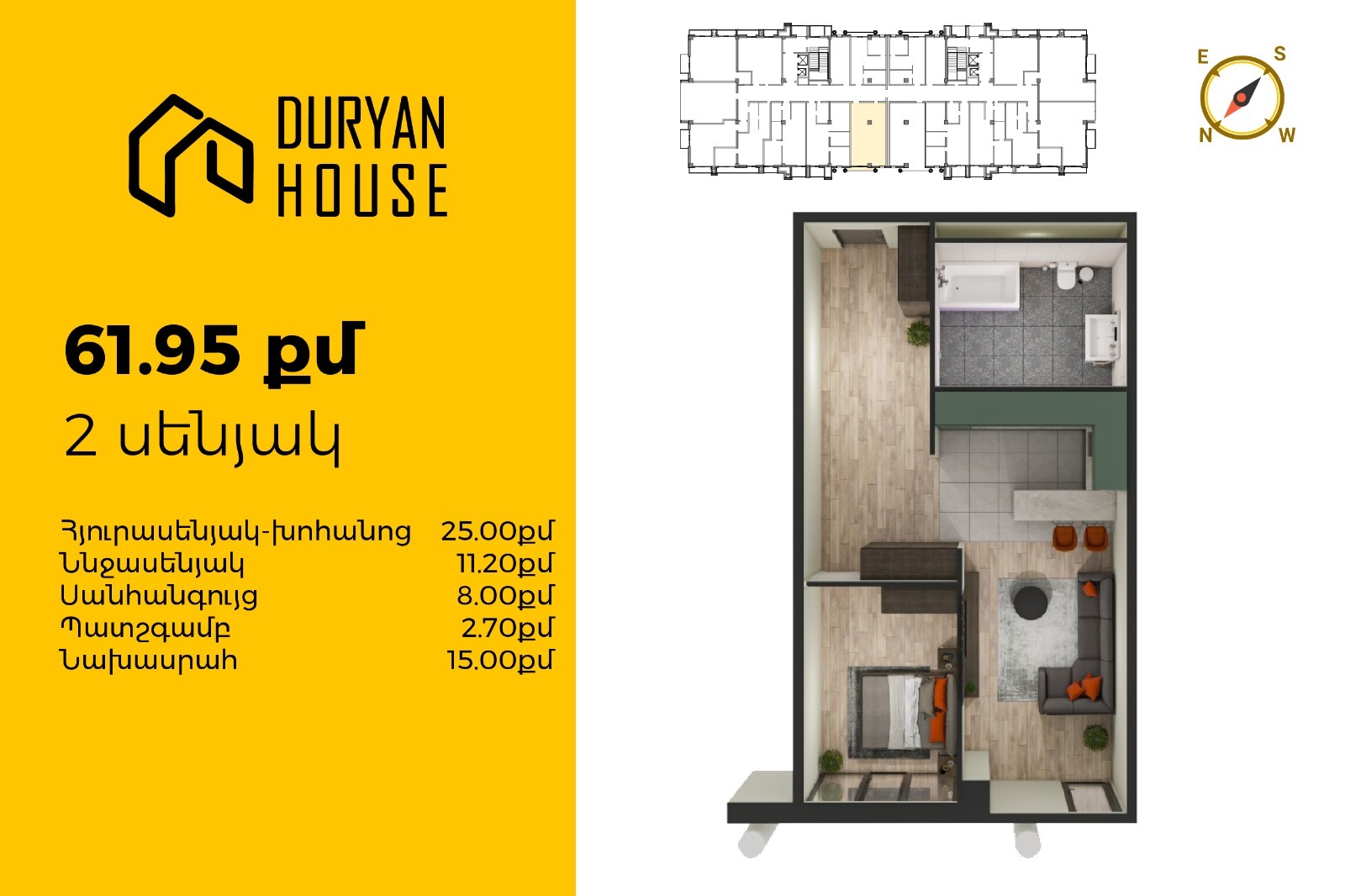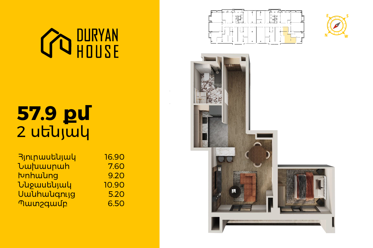 | 16-րդ հարկ | 58 քմ | 2 սենյակ